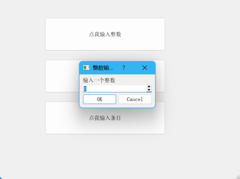 int result = QInputDialog::getInt(this, "整数输入对话框", "输入一个整数");