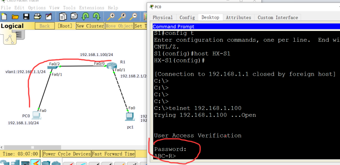小结:能分别通过两个终端PC远程交换机和路由器并进行管理