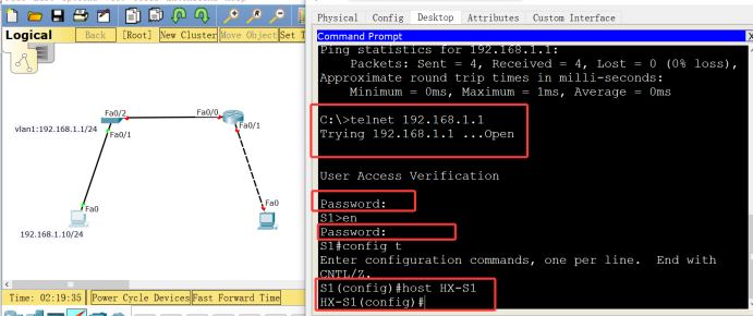 小结:使用telnet技术,登陆虚拟控制台,使用VTY密码进入交换机,然后使用加密密码进入交换机系统,然后获得控制权就可以修改交换机的名称为HX-S1
