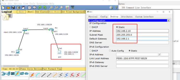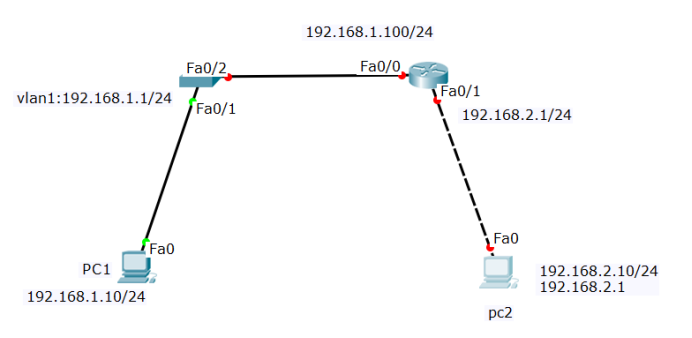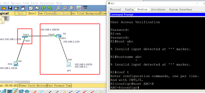 实验要求:让PC1远程到路由器,并通过路由器进入其内网与PC2通信