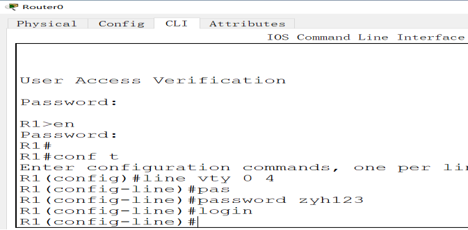 1.给路由器R1配置虚拟终端VTY 0 4 并配置远程登陆密码:zyh123