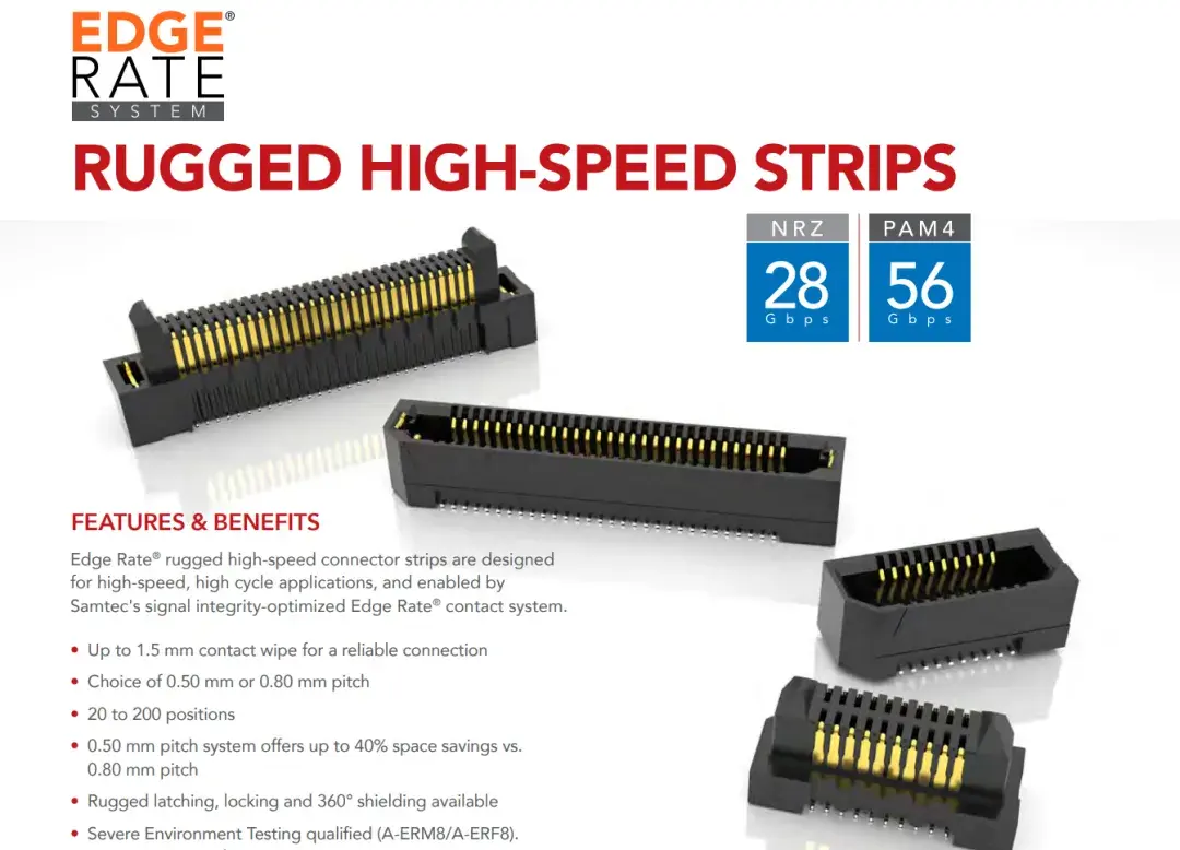 平视仪表盘显示,以及诸如地图、导航指示和车载通信工具等先进显示功能,都能从采用单个连接器处理信号和电源的设计中获益。在这一领域,许多Samtec的客户都使用我们的Edge Rate坚固型高速连接器(可选摩擦锁扣),应用于仪表盘内和车载信息娱乐系统。