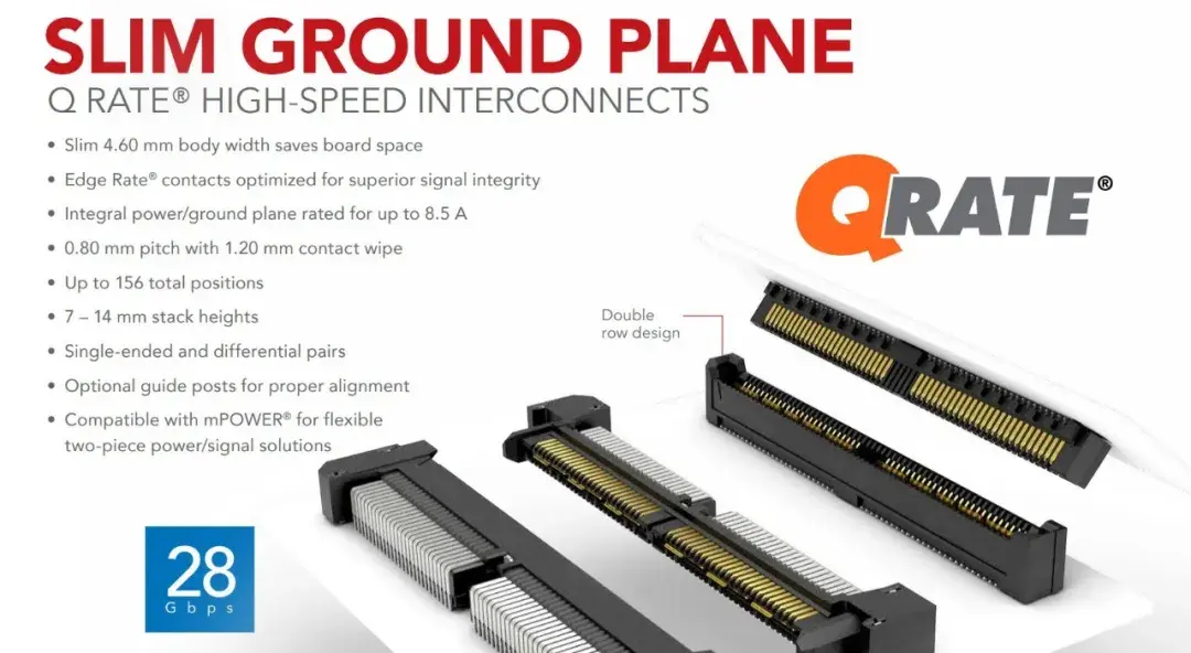 有些客户需要不同的配置,因而选择Q-Rate系列,其触点样式相同,但采用更纤薄的条形设计 。这些连接器的一个有趣特点是,您可以利用 Q-Rate 系列中的接地层来传输电源信号。