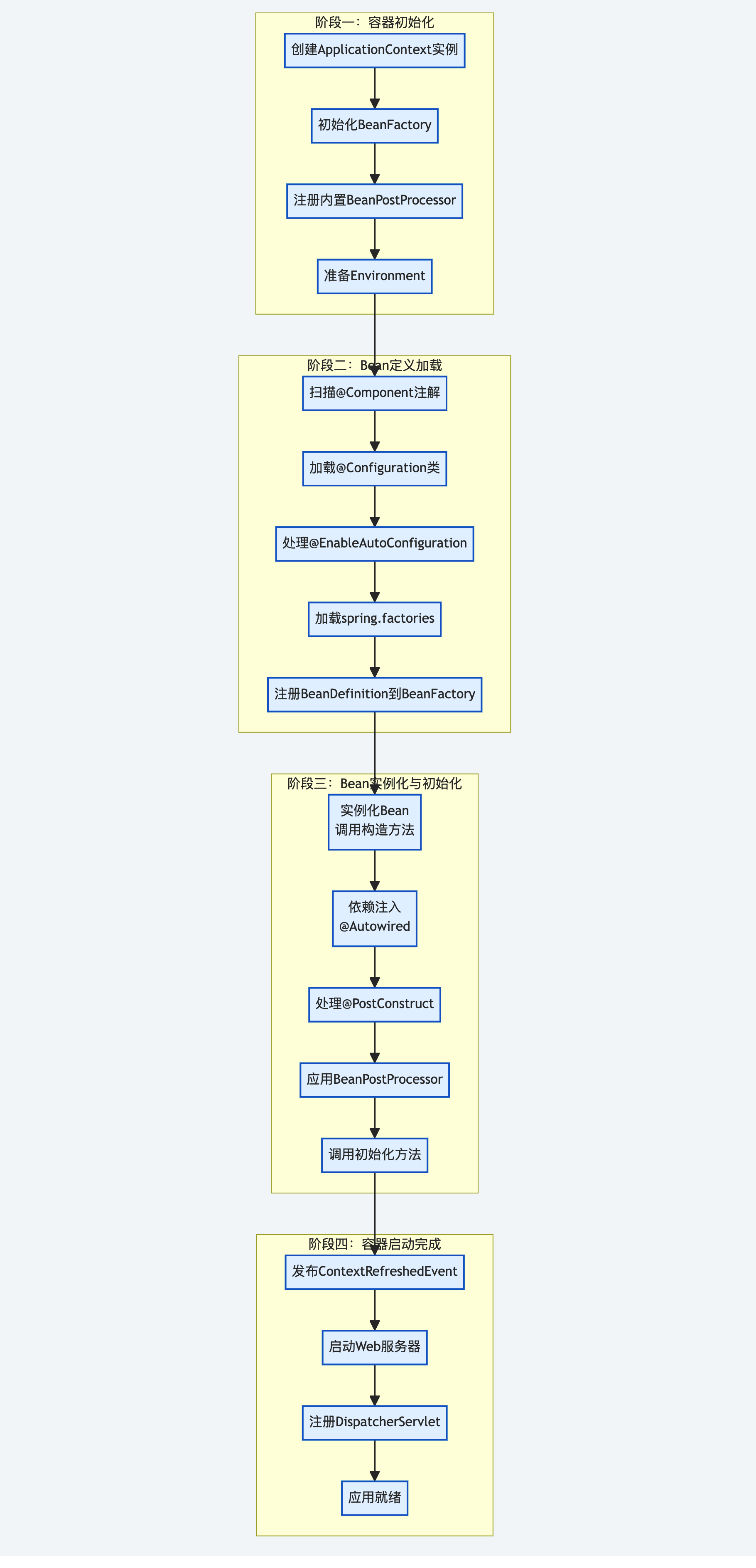 @SpringBootApplication注解开始,经历容器初始化、Bean定义加载、Bean实例化与初始化、容器启动完成四个阶段 -