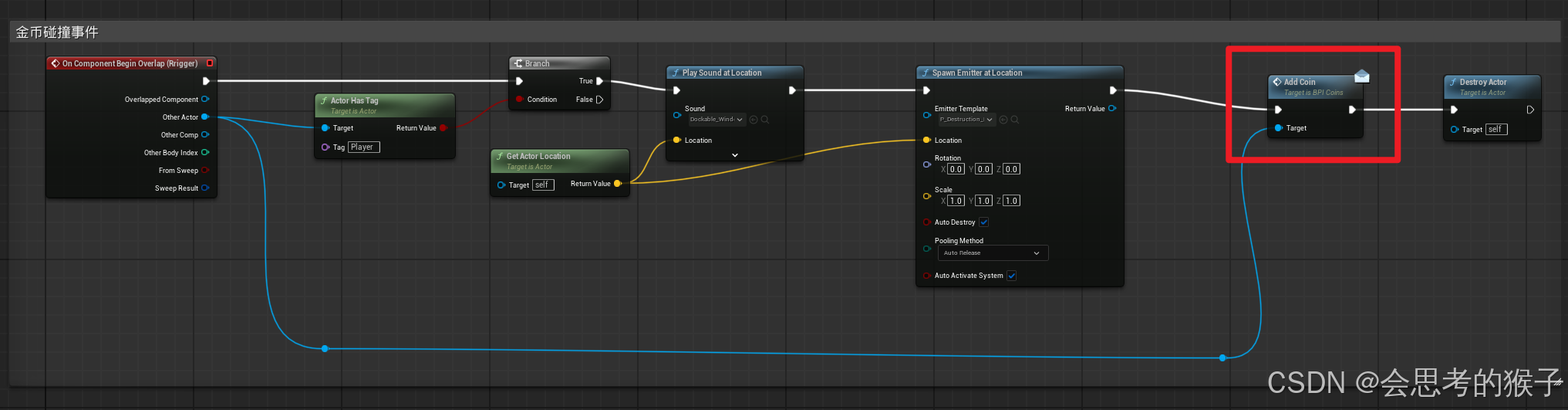 触发逻辑 (让玩家做这个!)Add Coin (Message) (消息)在 金币蓝图 中(调用蓝图)。