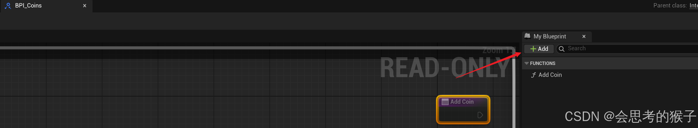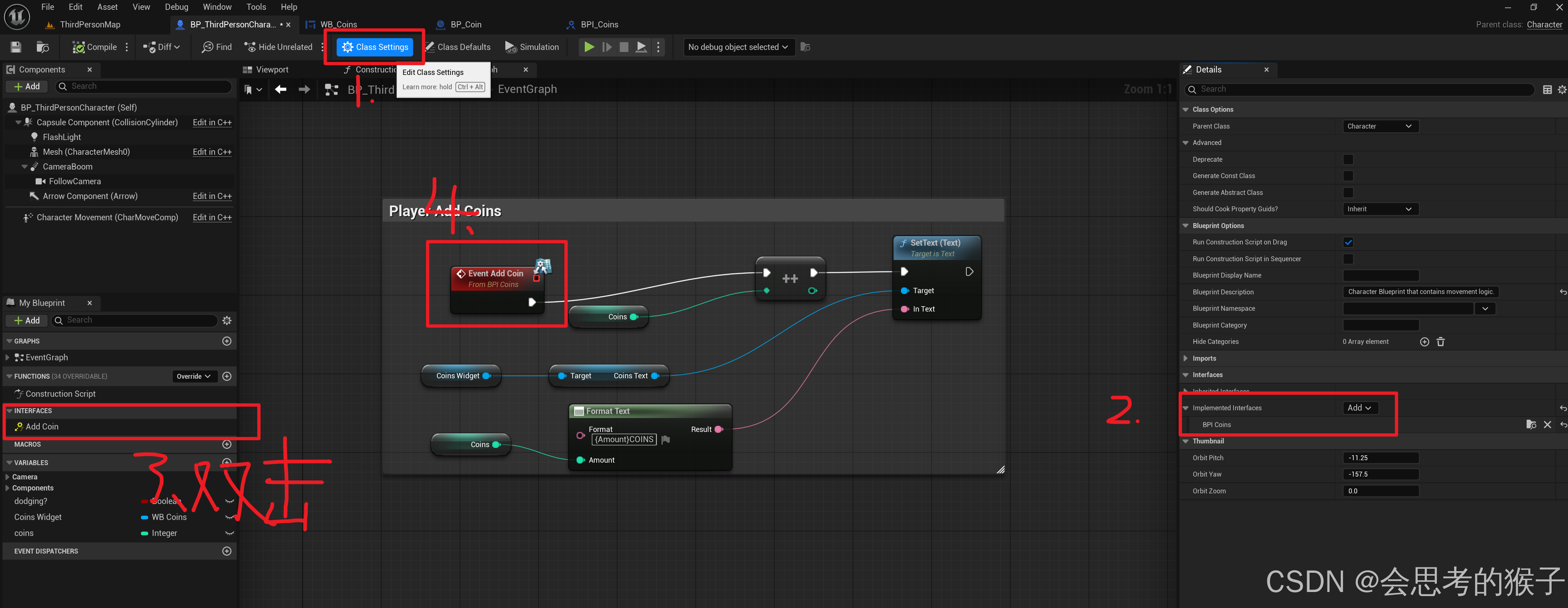 - 点击Class Settings,玩家实现 BPI_Coins 接口,在左侧窗口双击这个接口AddCoin函数,就会出来 Event Add Coin 这个接口函数,(必须双击 Add Coin,才会出来Event Add Coin 这个接口函数)