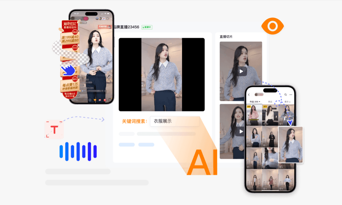通过RPA(机器人流程自动化)技术,iClip可自动抓取商品主图、详情页、直播切片等12类素材,结合计算机视觉算法实现智能拆条。例如,九牧王单日处理540条直播切片,系统自动识别高光片段并匹配动态字幕,使单条视频自然流量达37.8万。这种"一源多创"模式使素材利用率提升300%,安踏案例显示,AI生成的对比式开篇视频点击率比传统口播高47%。