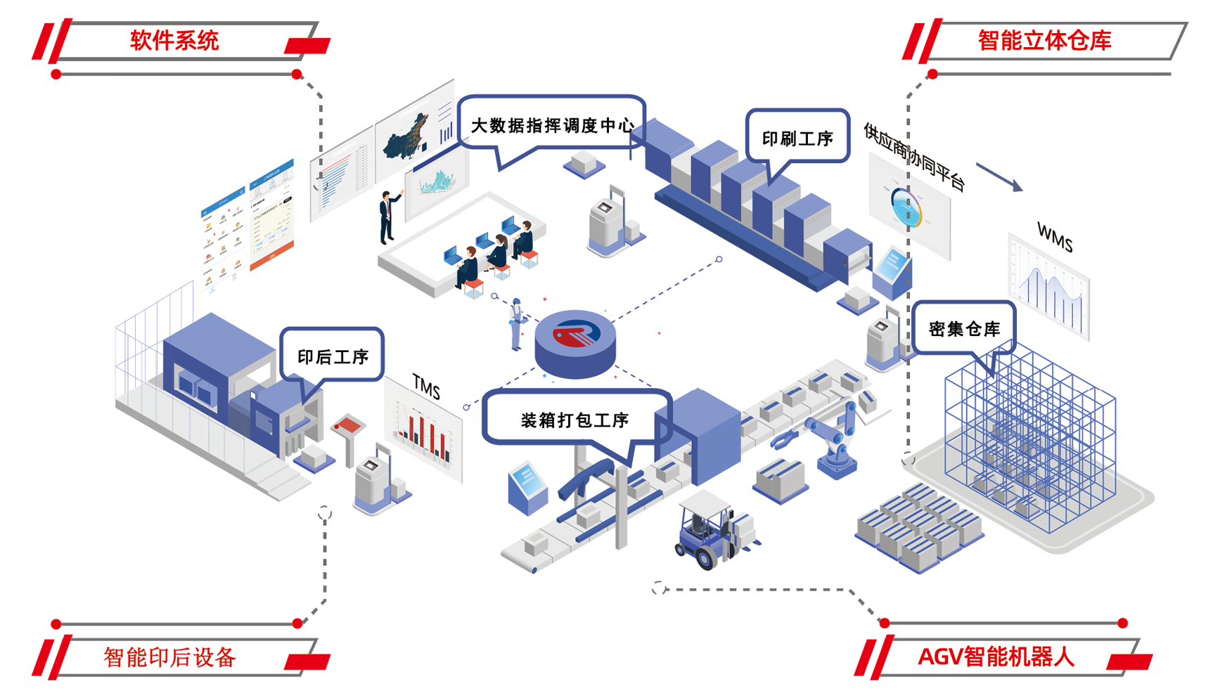 在这一体系中,AGV自动搬运机器人扮演着"智能搬运工"的核心角色。它不再局限于单一场景的应用,而是贯穿于生产与仓储的全流程之中。在印后设备环节,AGV能够实现工序间物料的自动转运与精准配送,有效衔接上下工序,减少人工干预与等待时间。同时,在厂内调度系统中,AGV依托智能路径规划与实时调度算法,自主完成多点多线的物料流转任务,大幅提升厂内物流的整体效率。
