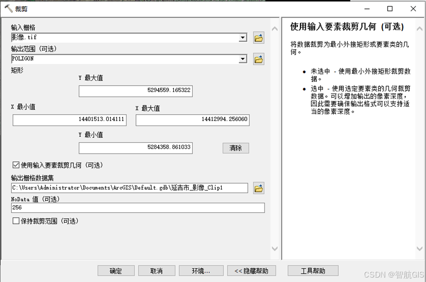 b. 使用以 x 和 y 坐标的最小值和最大值确定的包络矩形或使用输出范围文件来指定剪切区域。