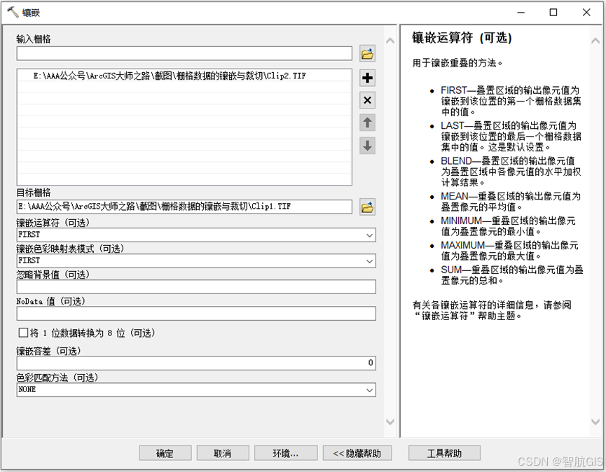c. 镶嵌运算符能控制叠置区域的运算方式,默认是LAST,如果要以目标栅格为准,需要把镶嵌运算符改为FIRST