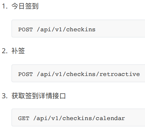 - 签到记录接口,返回当月签到记录、当月连续签到天数、当月可补签次数。