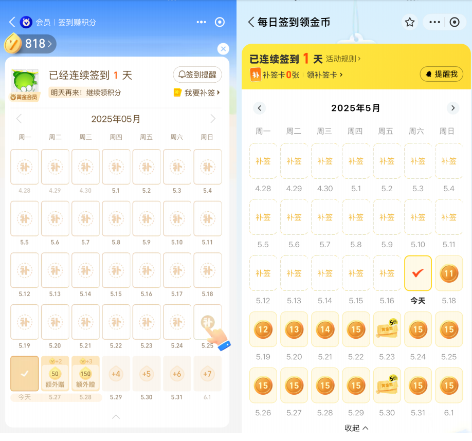 - 当月支持补签,每次补签消耗 100 积分,且每月最多补签三次。