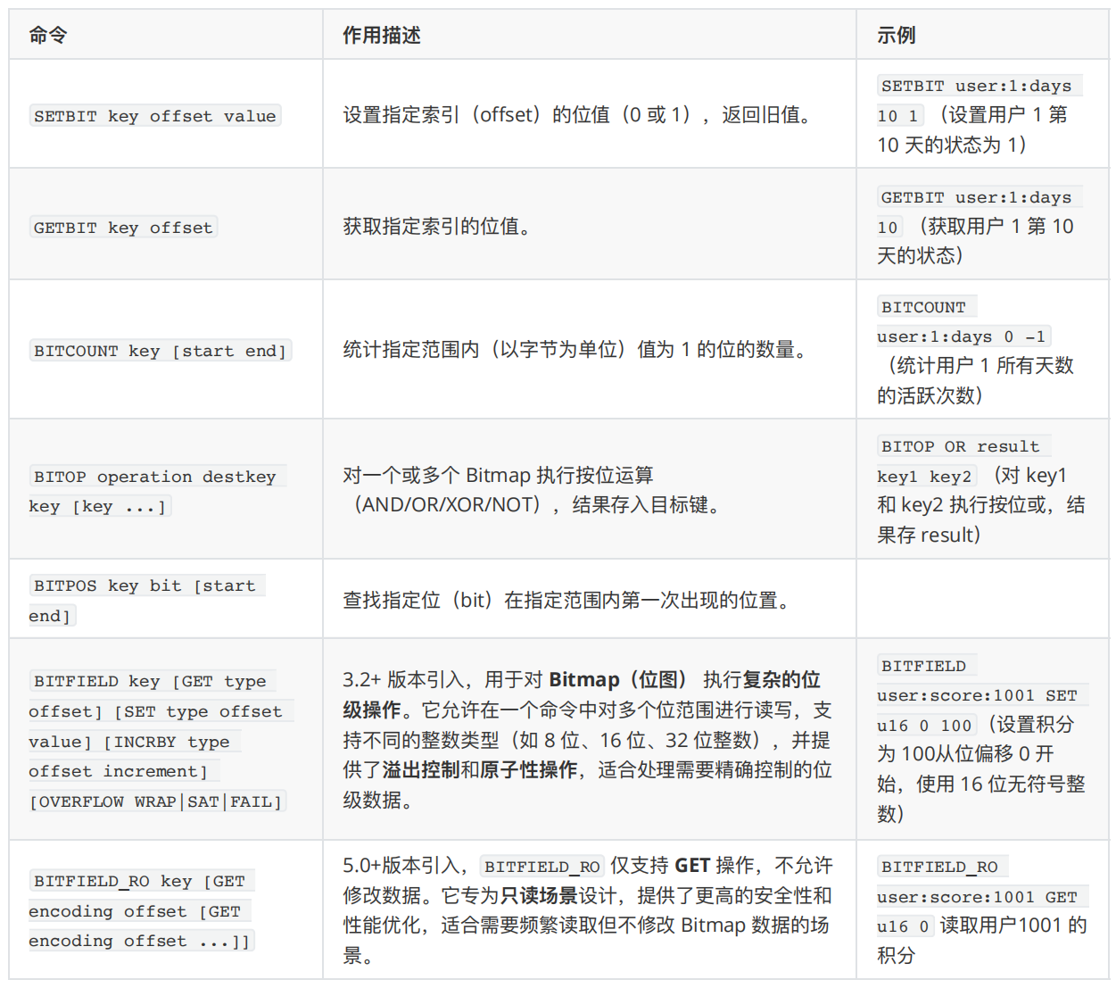 统计:通过 BITCOUNT 计算当月签到天数,或用 BITOP AND 统计多个用户的共同签到天数。