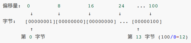 字节对齐:内存是以字节(8 位)为单位进行分配的。若你设置的最大偏移量是 1000,Redis 会分配 ceil(1001/8) = 126 字节(也就是 1008 位)。