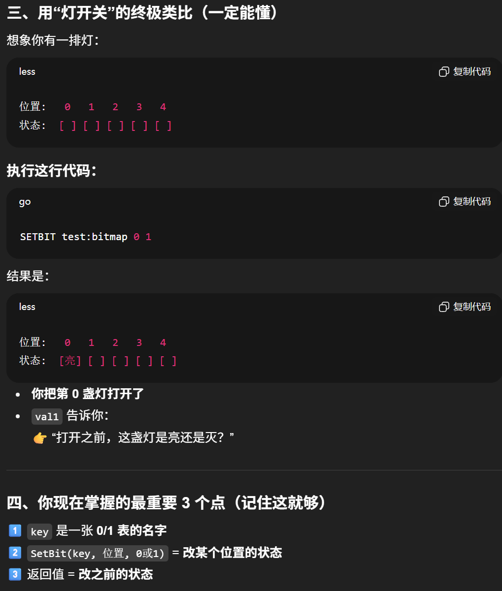 实现:用 user::uid:month 作为键,天数(1-31)作为 offset,每日签到时调用 SETBIT。