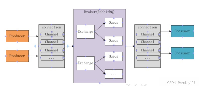 RabbitMQ 采用"生产者-交换机-队列-消费者"的核心架构,消息从生产到消费需经过四个关键节点,每个节点承担特定职责,确保消息高效、可靠地流转。同时依赖连接(Connection)和通道(Channel)实现与外部应用的通信,构成完整的消息传递链路。