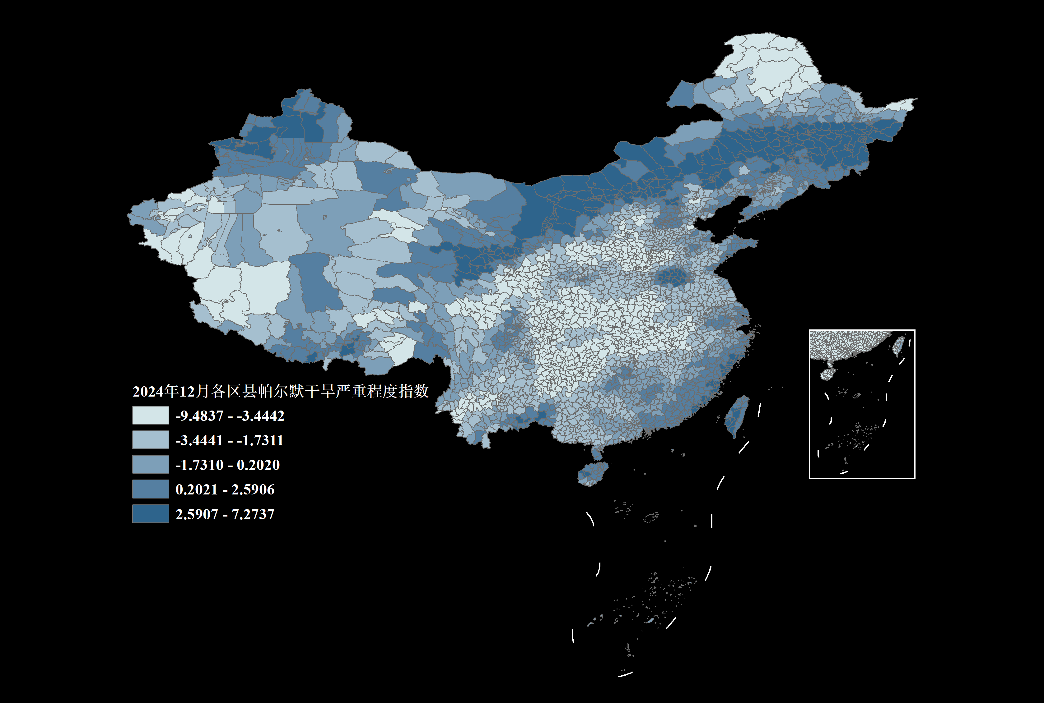 接着,我们再以区县级别2024年12月的帕尔默干旱严重程度指数数据为例来预览一下Shp格式的数据:
