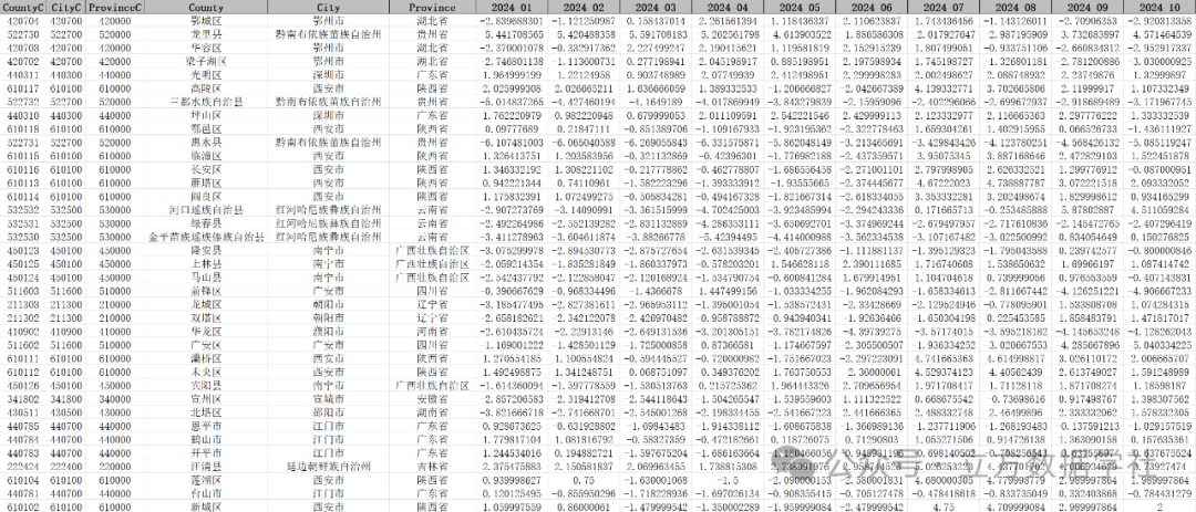 基于原始的逐月帕尔默干旱严重程度指数栅格数据,我们采用国家地理信息公共服务平台(天地图)发布的审图号为GS(2024)0650号的2024年省市县三级行政区划Shp数据(可查看之前的文章获悉详情),对每个省\每个地级市\每个区县内的栅格值进行了求平均数处理,得到了省市县三级的逐月帕尔默干旱严重程度指数数据!