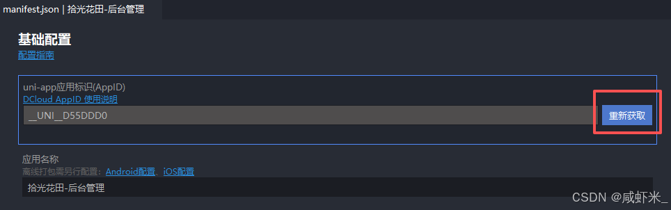 在两个项目中的根目录下找到manifest.json,修改一下应用名称,如果不修改,打包的时候将沿用初始名称,并重新获取uni-app应用标识(该操作仅限一次)
