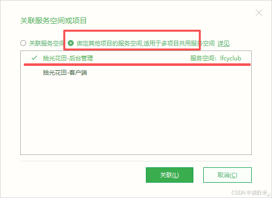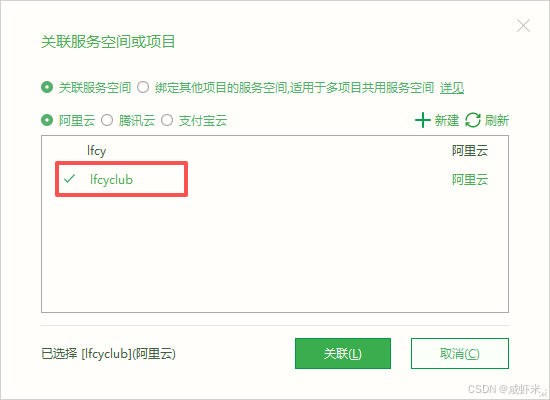 创建完服务空间后,在后台管理项目的uniCloud目录上单击右键"关联服务空间"