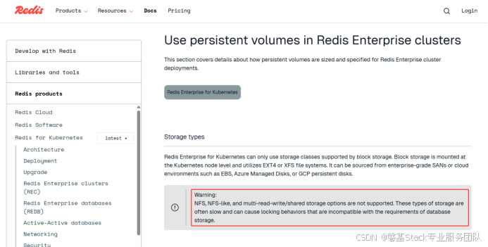 - 在高并发或写多读少场景下,避免使用NFS / Ceph等依赖网络性能作为持久化存储介质。下图是官方警告说明。