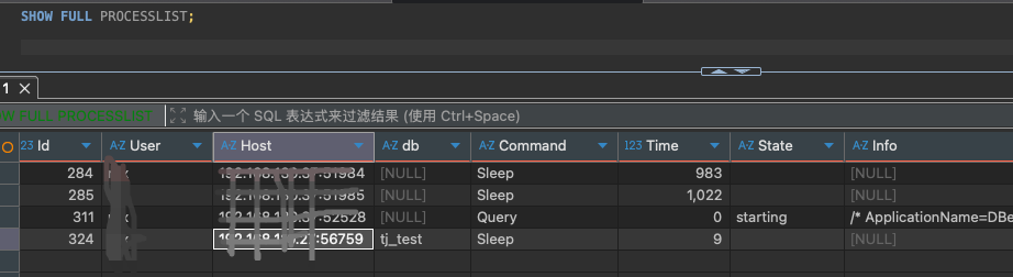 在Host列找到具体的连接IP,例如找到IP是:192.168.110.27