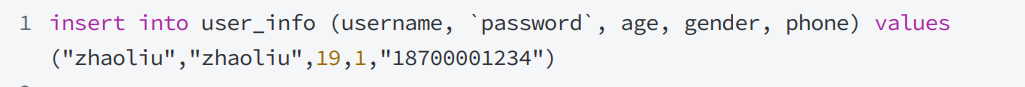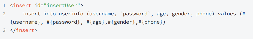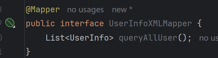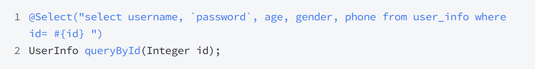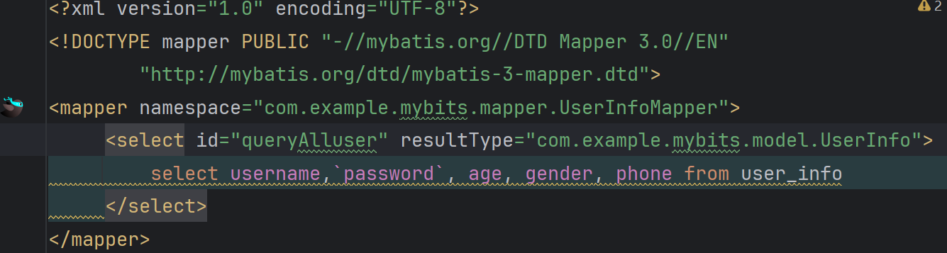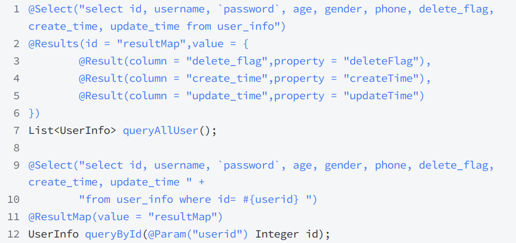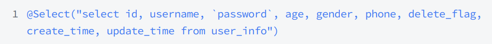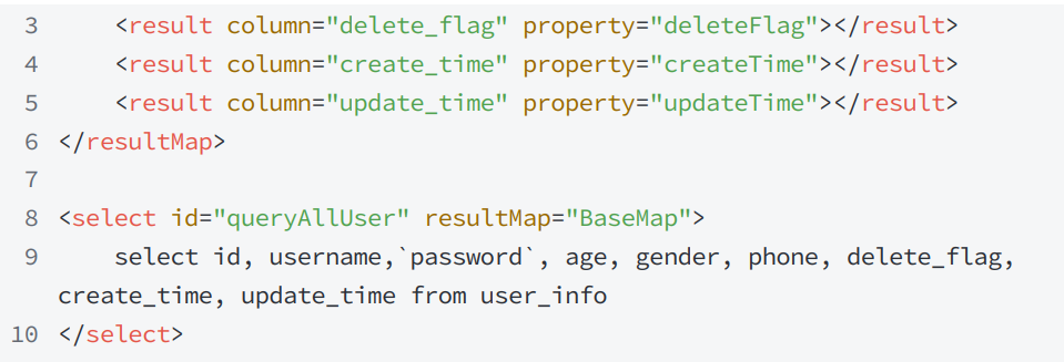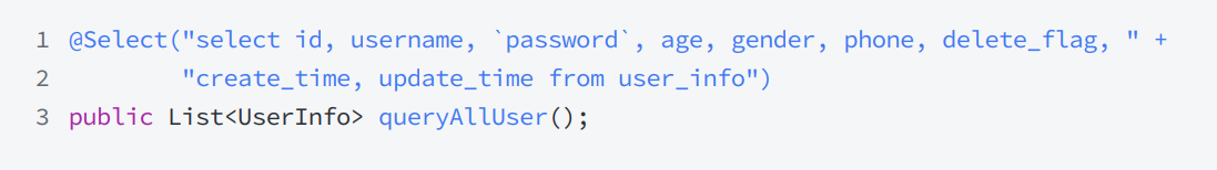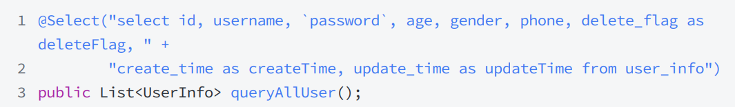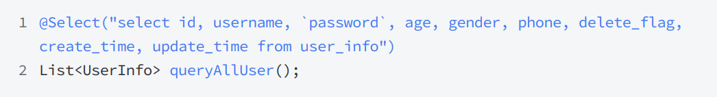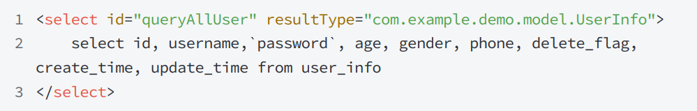 namespace="com.example.mybatis.mapper.UserInfoMapper"绑定接口<select id="queryAllUser" resultType="com.example.mybatis.model.UserInfo">select username, password, age, gender, phone from user_info</select>实现方法