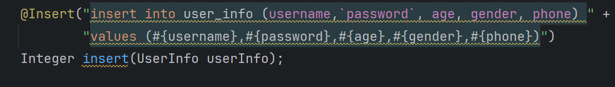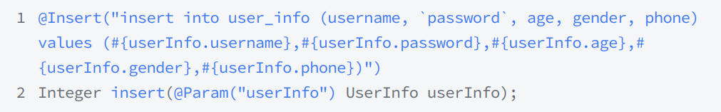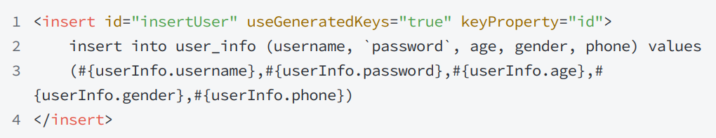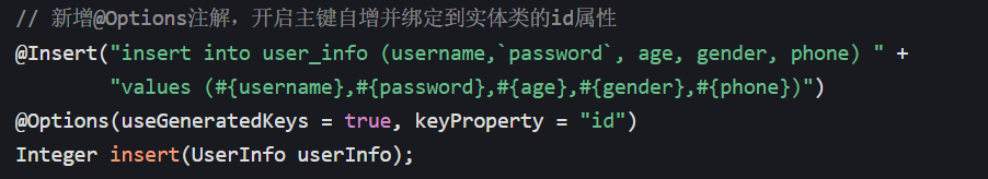 注意:如果你的user_info表主键id是自增类型 (绝大多数场景都是),必须给@Insert补充@Options注解,否则插入后无法获取自增的主键 ID