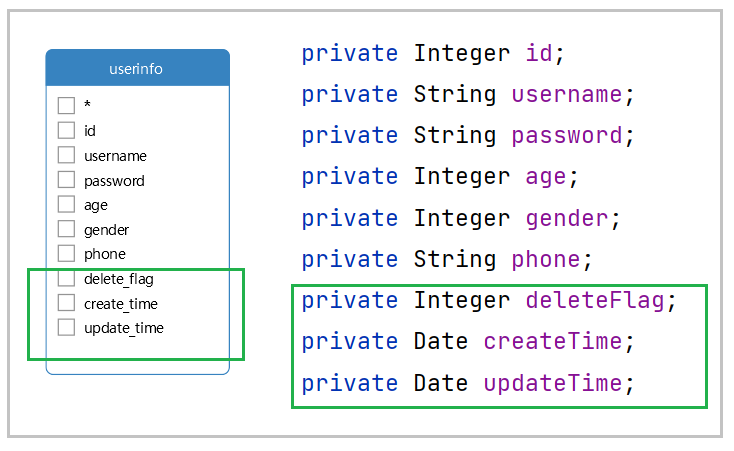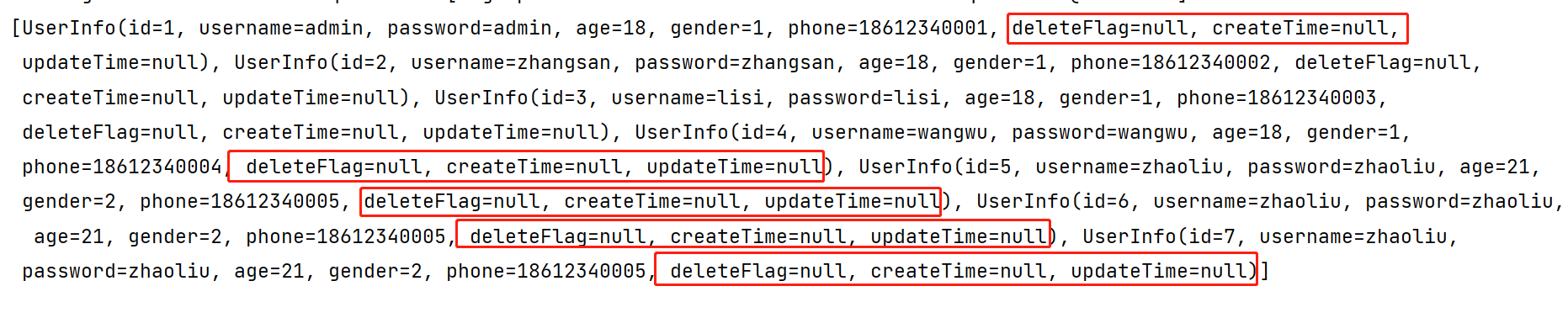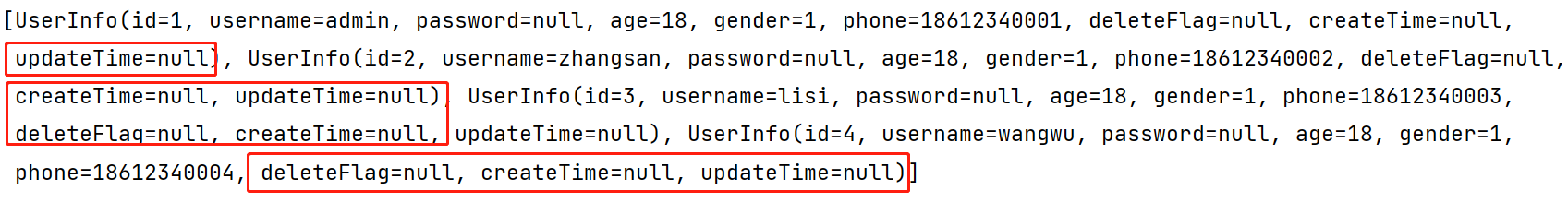 从运⾏结果上可以看到,我们SQL语句中,查询了delete_flag,create_time,update_time,但是这⼏个 属性却没有赋值.