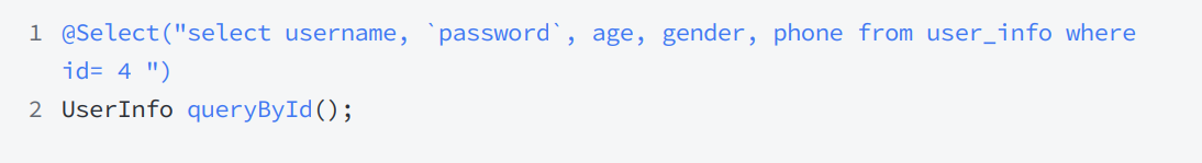 - 方法用对象 UserInfo 接收返回结果,MySQL 查询出来数据为一条,就会自动赋值给对象.