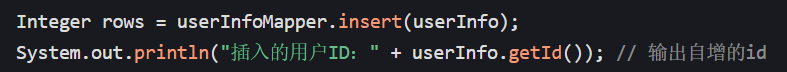 useGeneratedKeys = true:告诉 MyBatis "获取数据库自增的主键值";keyProperty = "id":把自增的主键值赋值到UserInfo对象的id属性;- 插入后可直接获取主键: