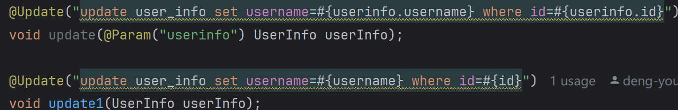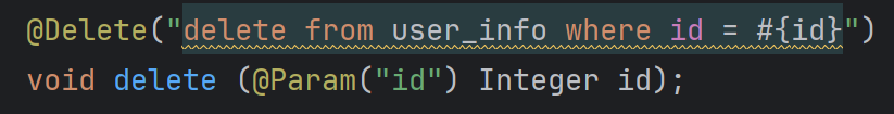 @Param("别名")给参数命名后,SQL 中#{}必须使用该别名。 - 适用场景:方法有多个参数、或参数名不直观时,避免参数绑定混乱。