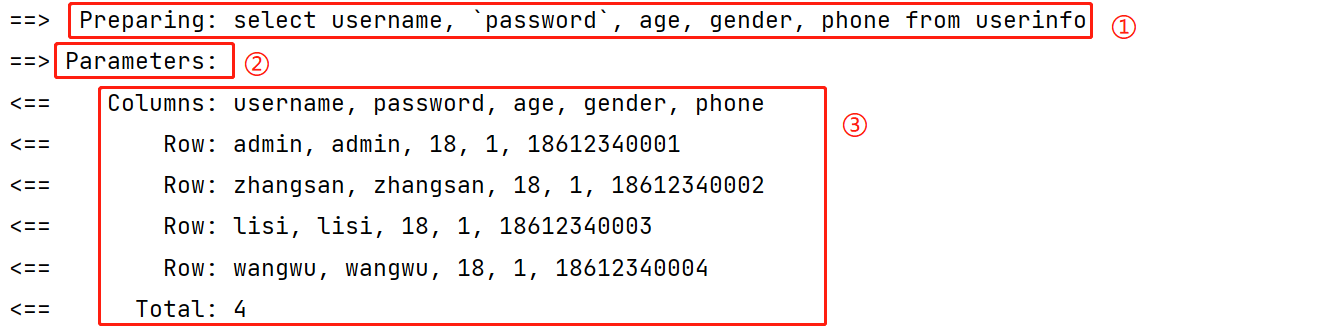 - ①:查询语句 ②:传递参数及类型 ③:SQL执⾏结果