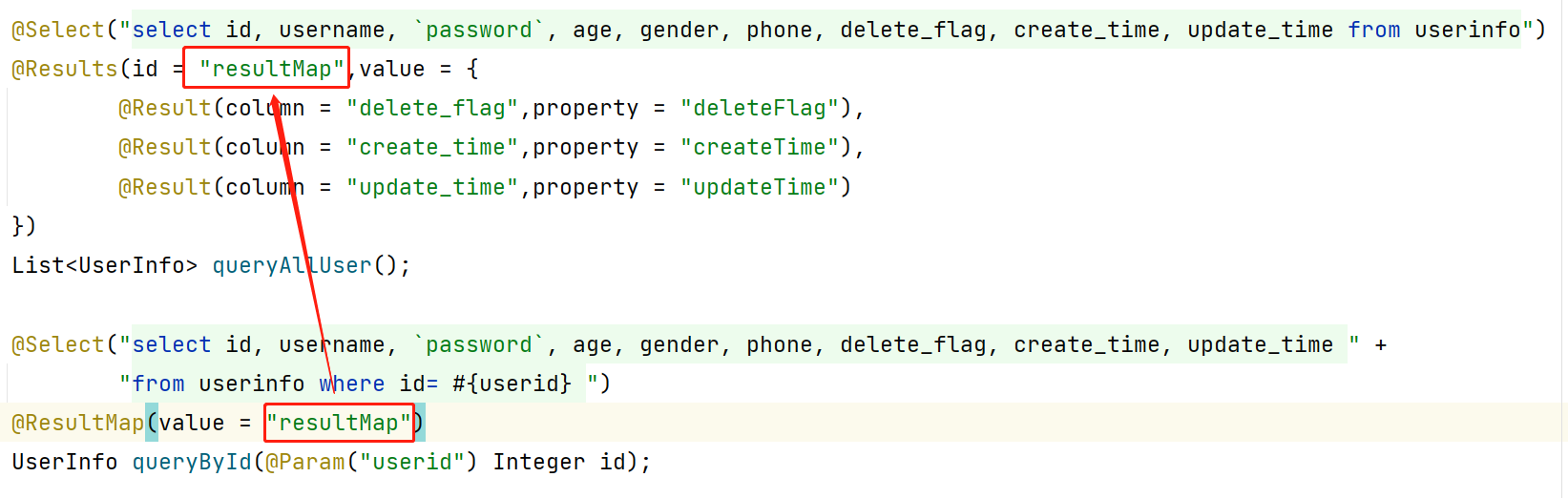 使⽤id 属性给该Results 定义别名,使⽤@ResultMap 注解来复⽤其他定义的 ResultMap