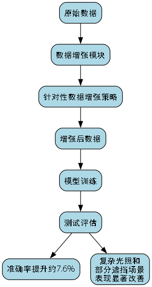 数据增强不仅增加了训练数据的多样性,还提高了模型的泛化能力。通过对比实验发现,采用针对性的数据增强策略后,模型在测试集上的准确率提升了约7.6%,特别是在复杂光照和部分遮挡场景下的表现显著改善。