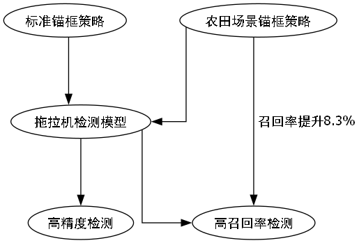 通过实验发现,针对农田场景设计的锚框策略比标准锚框策略在拖拉机检测任务上提高了约8.3%的召回率,同时保持了较高的精度。这是因为我们根据农田场景中目标的实际尺寸比例和分布特点,设计了更加贴合实际应用的锚框参数,使得模型能够更好地捕捉不同大小和比例的目标对象。