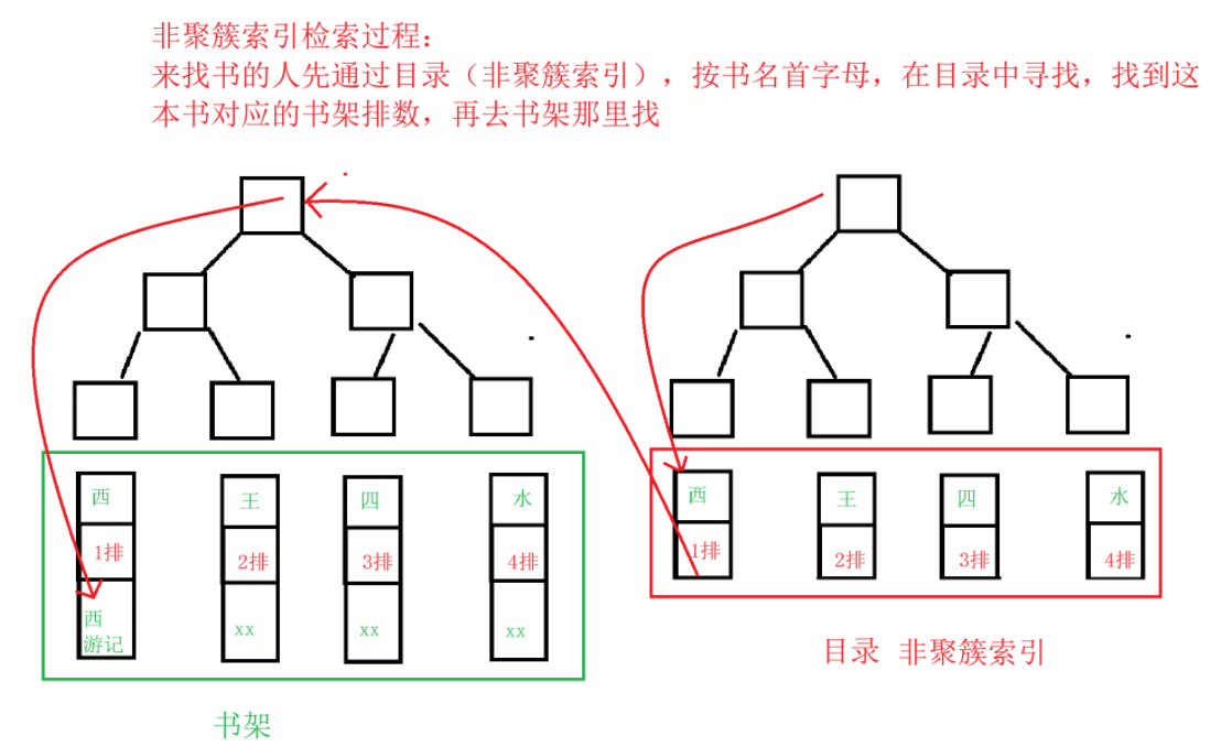 查找《西游记》:先查目录找到书名和书架号(非聚簇索引),再回书架取书(回表)。