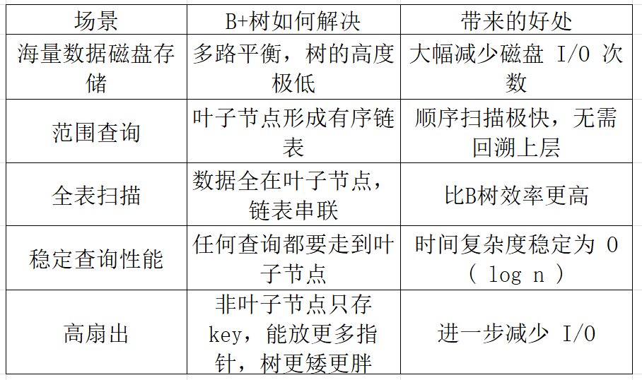 优势: 范围查询超高效(顺序扫描叶子链表即可)、全表扫描更快(只需遍历叶子节点)、查询更稳定(都要查到叶子层)。