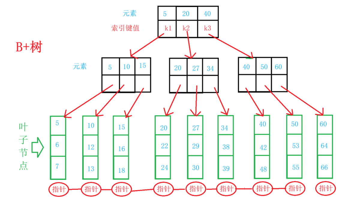 **2)**B+树 的叶子节点存储数据;非叶子节点存储索引键值;