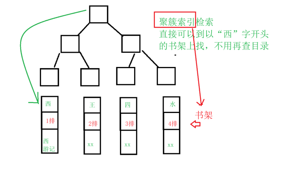 1)场景:图书馆有独立的目录(非聚簇索引),按书名首字母名排目录,目录里存书名和书架号(主键值)。