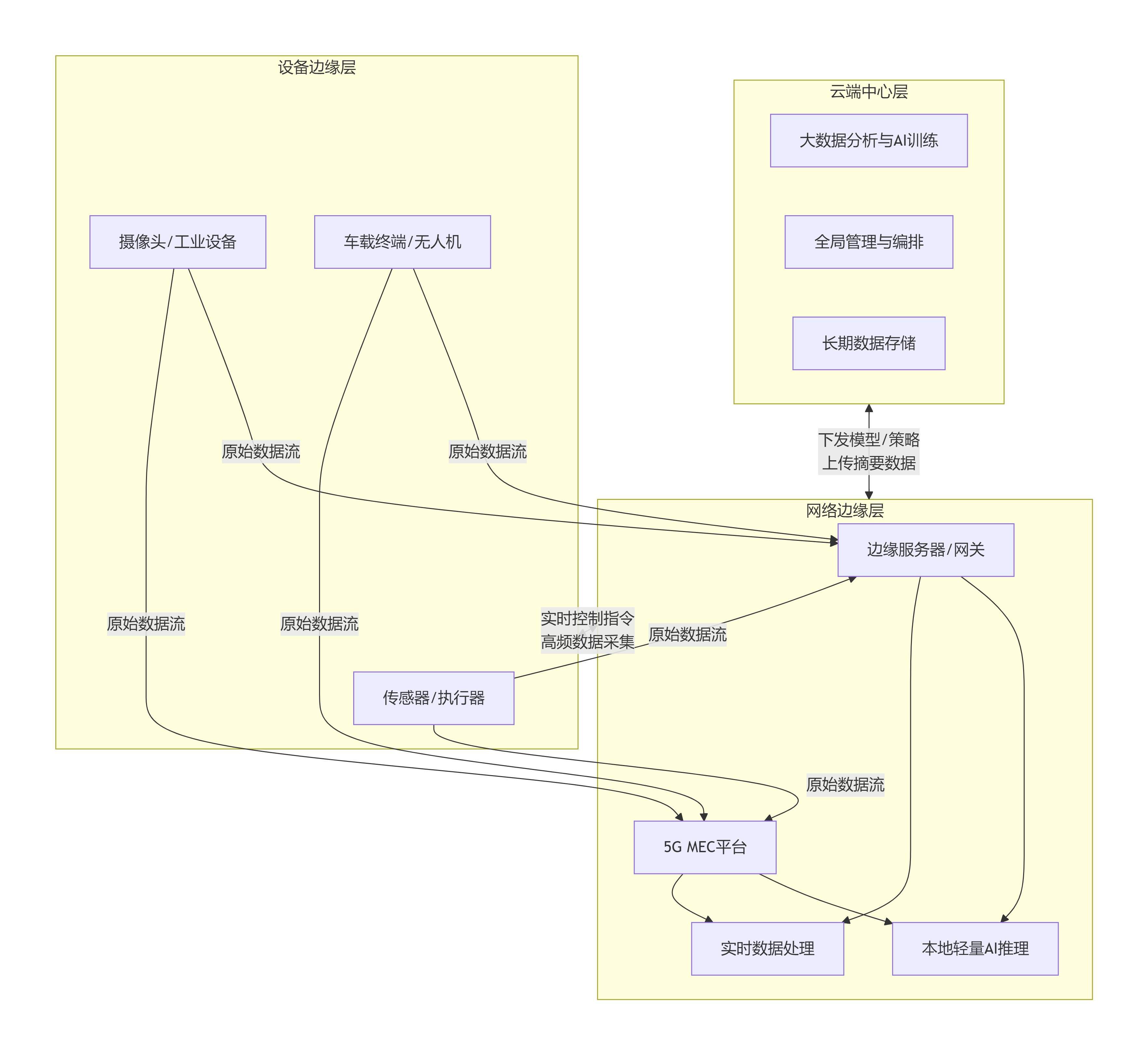 职能:本地数据汇聚与流处理、轻量级AI模型推理与执行、低时延业务本地闭环、局部资源调度、向云端上传有价值数据/模型更新。