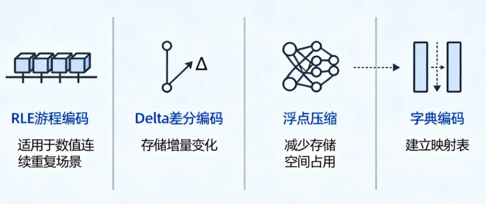 - Delta 编码:利用相邻时间戳或数值的差值较小特性。