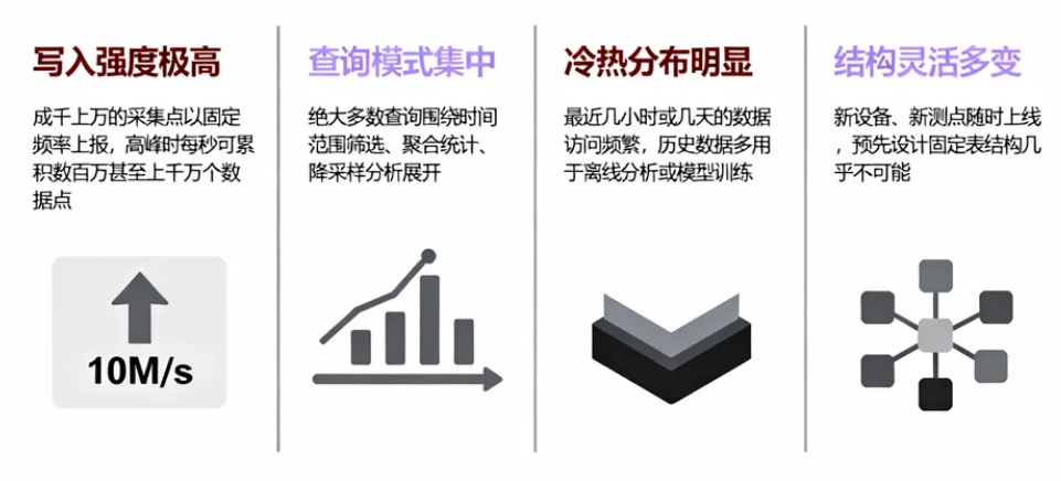 - 结构灵活多变:新设备、新测点随时上线,预先设计固定表结构几乎不可能。