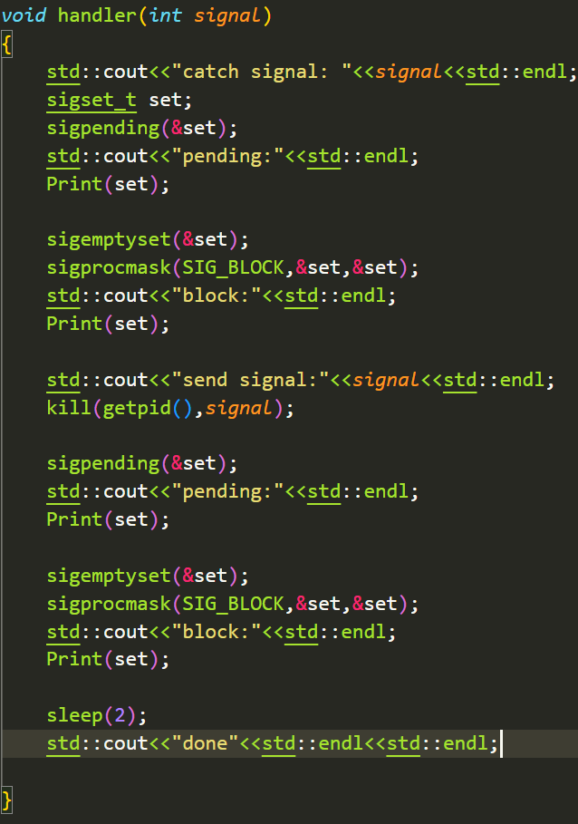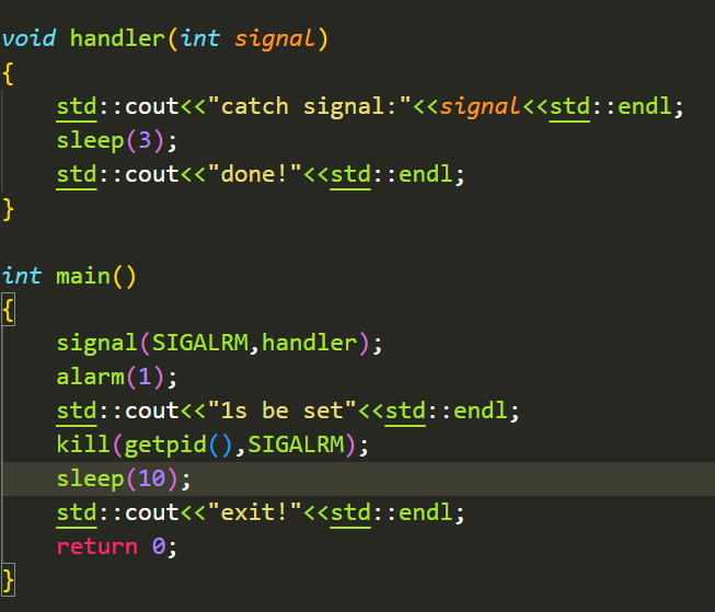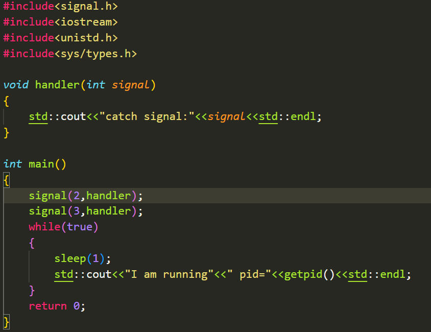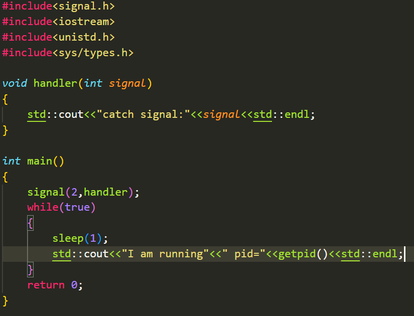 std::cout << "get a signal: " << signo << " pid: " << getpid() << std::endl;