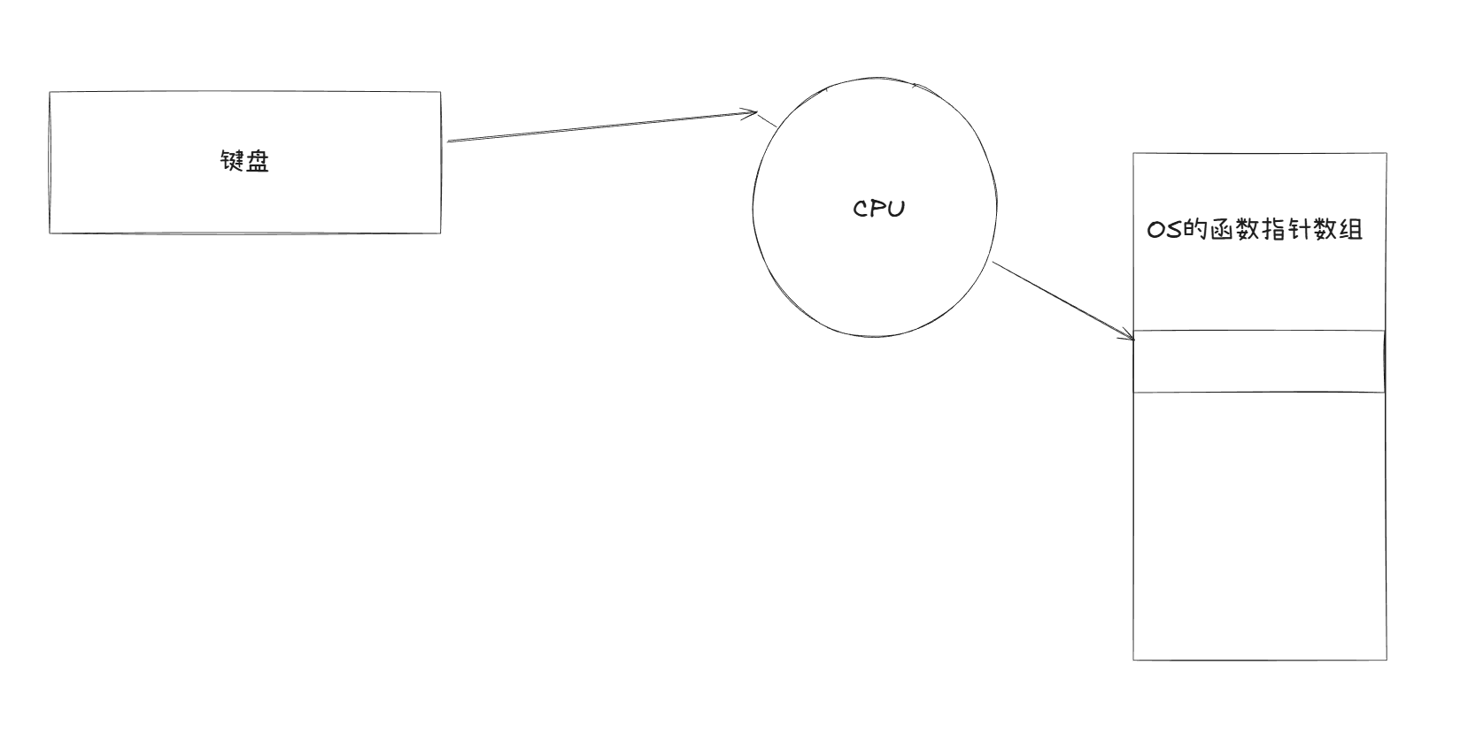 当按下按键的时候,键盘会通过硬件给cpu发送中断信号。CPU将中断信号给OS,OS就会停下正在运行的进程,执行中断号在函数指针数组上对应的函数,拷贝键盘数据到内存上。