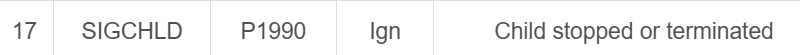 | 17 | SIGCHLD | P1990 | Ign | Child stopped or terminated |