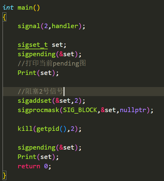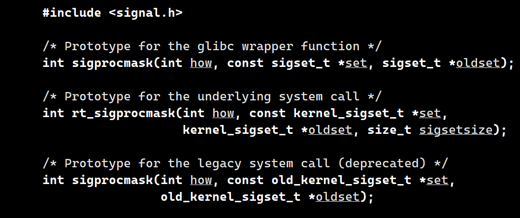其中how包括三种参数:SIG_BLOCK、SIG_UNBLOCK、SIG_SETMASK.第一个参数相当于将我们添加set中的信号到block中,第二个自然就是接触,第三个则是将block图设置成set的样子。