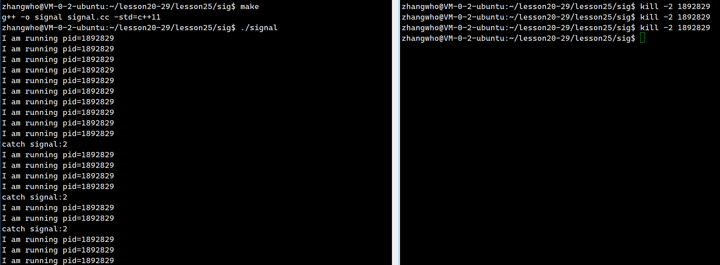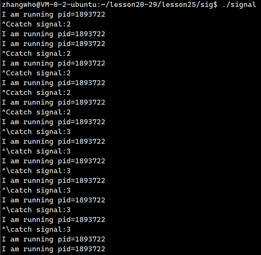 第一个参数是要捕捉的信号可以传数字也可以传对应的信号名,第二个则是void(int)的函数指针。自然第二个参数就是我们的自定义处理方式。