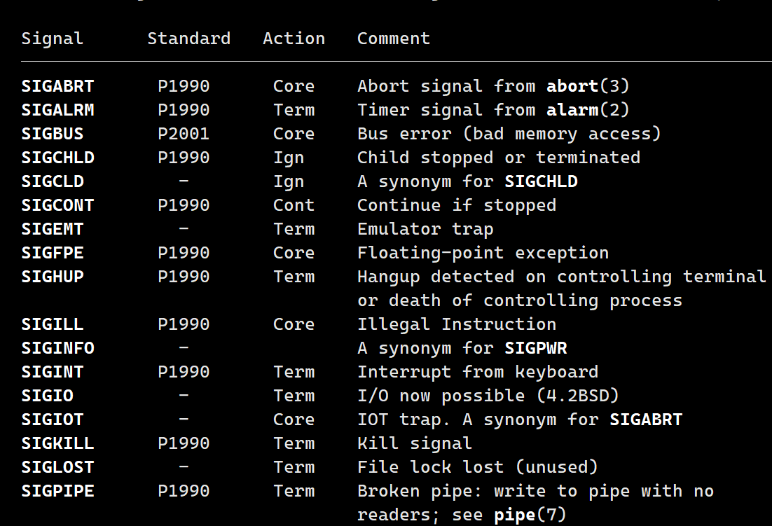 | 13 | SIGPIPE | P1990 | Term | Broken pipe: write to pipe with no readers; see pipe(7) |