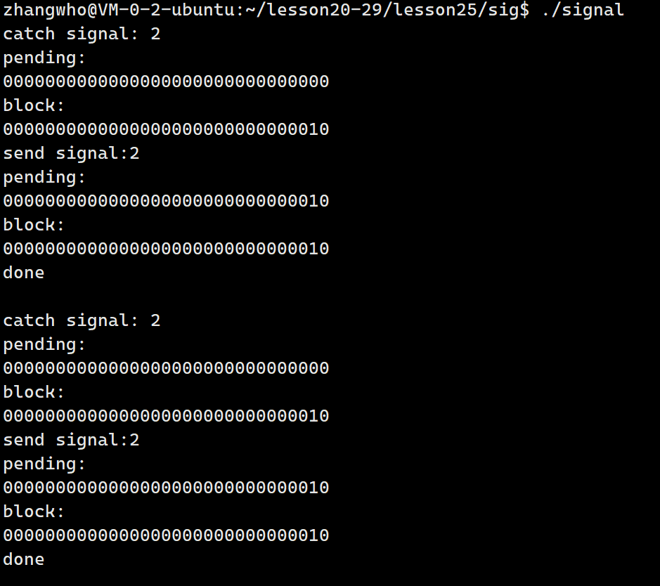 可以看到处理该信号时会自动对该信号进行阻塞,这也是为什么我们处理这个信号的时候接收到同一个信号不会立刻处理。然后收到相同的信号时就会放到pending图上。最后处理结束之后再处理该信号。